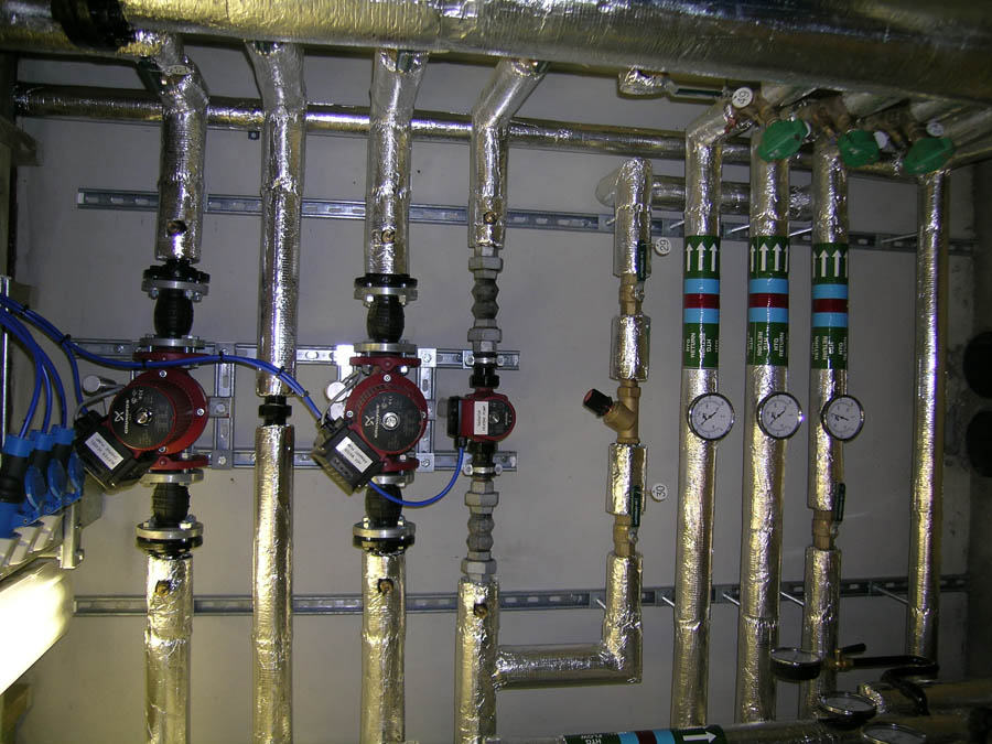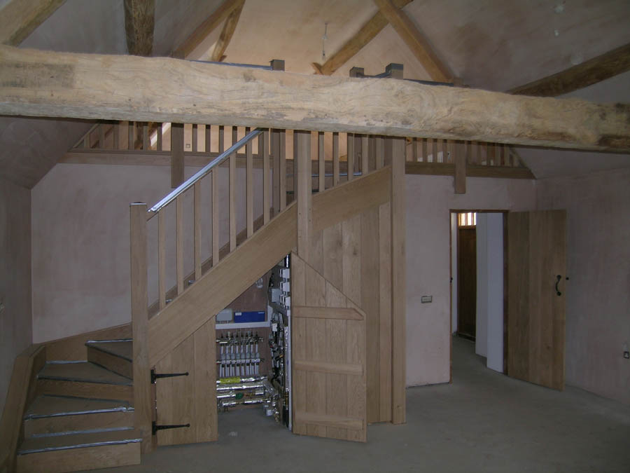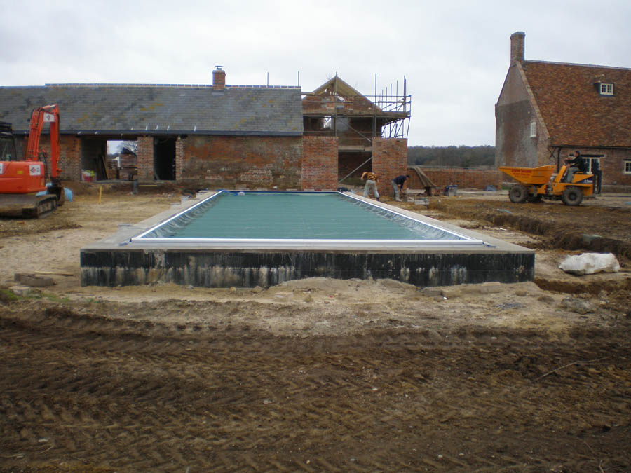 The client requested that the design be as “green” as possible but planning restrictions precluded mounting solar thermal of PV panels on roofs, and wind turbines. The high water table in the area meant that boreholing for ground source energy could cause problems with the Environmental Agency. A closed loop ground source heat pump system was decided upon using 6 x 50m “slinkey” pipes in trenches for the farmhouse ground floor and a slightly smaller array for the Phase 2 Holiday let. A Viessman BW220 heat pump was coupled with a 200 litre buffer vessel for the farmhouse ground floor underfloor heating system. Oil-fired boilers were provided to serve as back up and to provide heat to upper floor radiator circuits and hot water calorifiers. The heating system also provided heat to the swimming pool. A 5000 ltr oil tank was provided and connected to pumped ring main that could be tapped into for future phases.